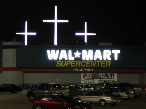 From frankb. I have to see these all the time; I don’t like it, but I understand that believers have their property and their rights, etc. Indeed, I’d rather see big crosses than big Wal*Marts.