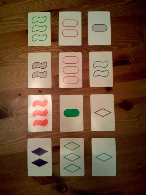 The game is called Set. You put out 12 from the deck. Everyone crowds around and tries to identify sets of three where “each feature is either the same on all of the cards, or different on all of the cards”. If you correctly identify a set, you get a point, the three cards are removed, and another three are added. It requires extreme concentration.