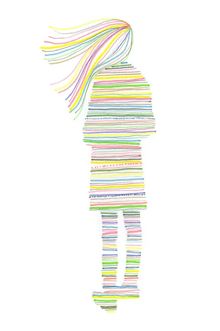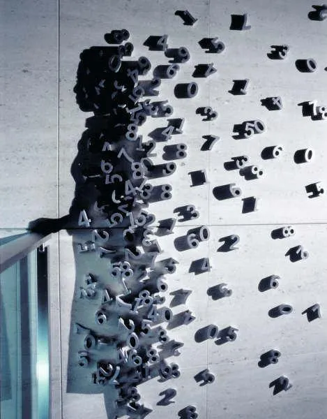 Description: The numbers scattered on the wall, lit from the right, cast a silhouette of a woman. -