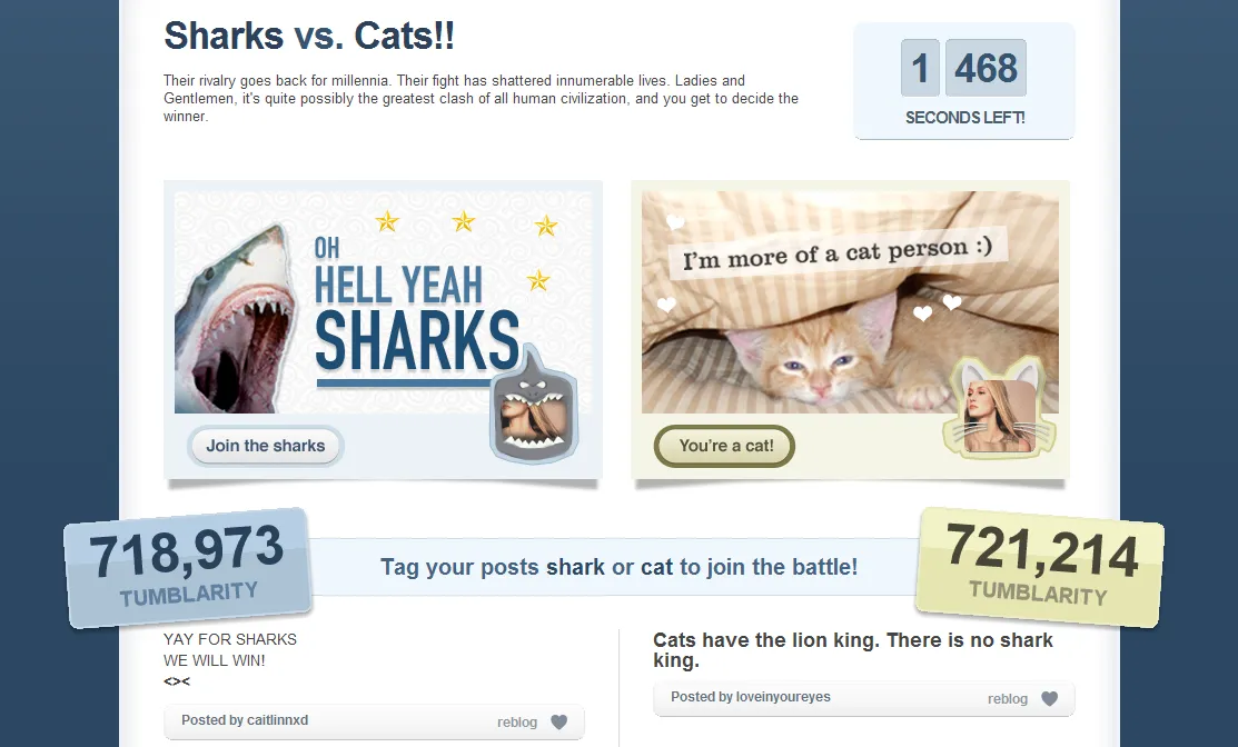 After more than 1.5 million Tumblarity, 105,295 posts, and a tedious manual hand recount, we’re excited to officially announce that Cats have narrowly beaten Sharks.