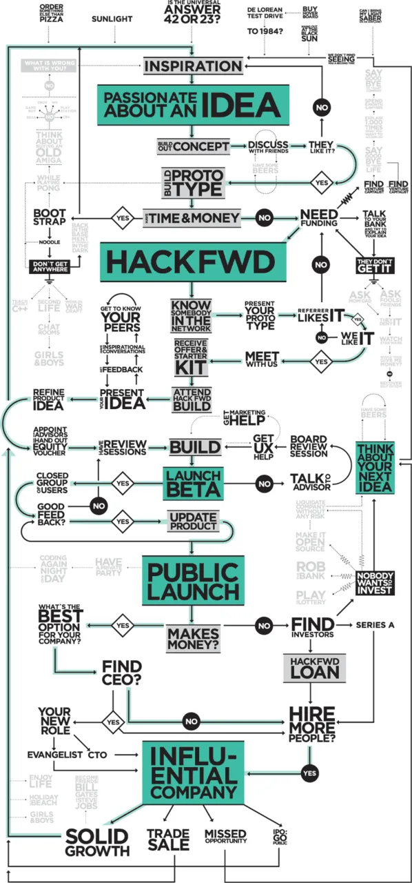 Диаграмма на сайте HACKFWD про устройство правильного стартапа, включая такие пункты, как определение того, является ли универсальным ответом 23 или 42, ответ на вопрос о том, можно ли принести с собой лазерный меч, а также что делать дальше, когда всем пофиг (дейтинг, вести телешоу, уйти в Секонд Лайф). PDF-версию можно скачать и распечатать на пенокартоне, чтобы ходить мимо неё каждый день.