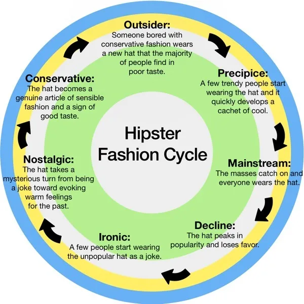 Жизненный цикл хипстерской моды — диаграмма Эмили Митнер (Emily Miethner) с сайта Flavorwire, с круговоротом из семи стадий от открытия новинки до ностальгии и превращения модного прежде аксессуара в нелепый бабушкин носок, который потом извлекается наружу из сундуков и превращается в винтажную ультра-новинку, понятную лишь избранным.