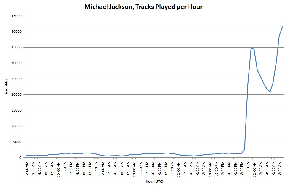 Свежие цифры прямо из нашего великого убер-хранилища: по мере того, как расходятся новости, к нам стекаются всё новые и новые данные о том, как люди отдают дань уважения одному из величайших поп-артистов всех времён.